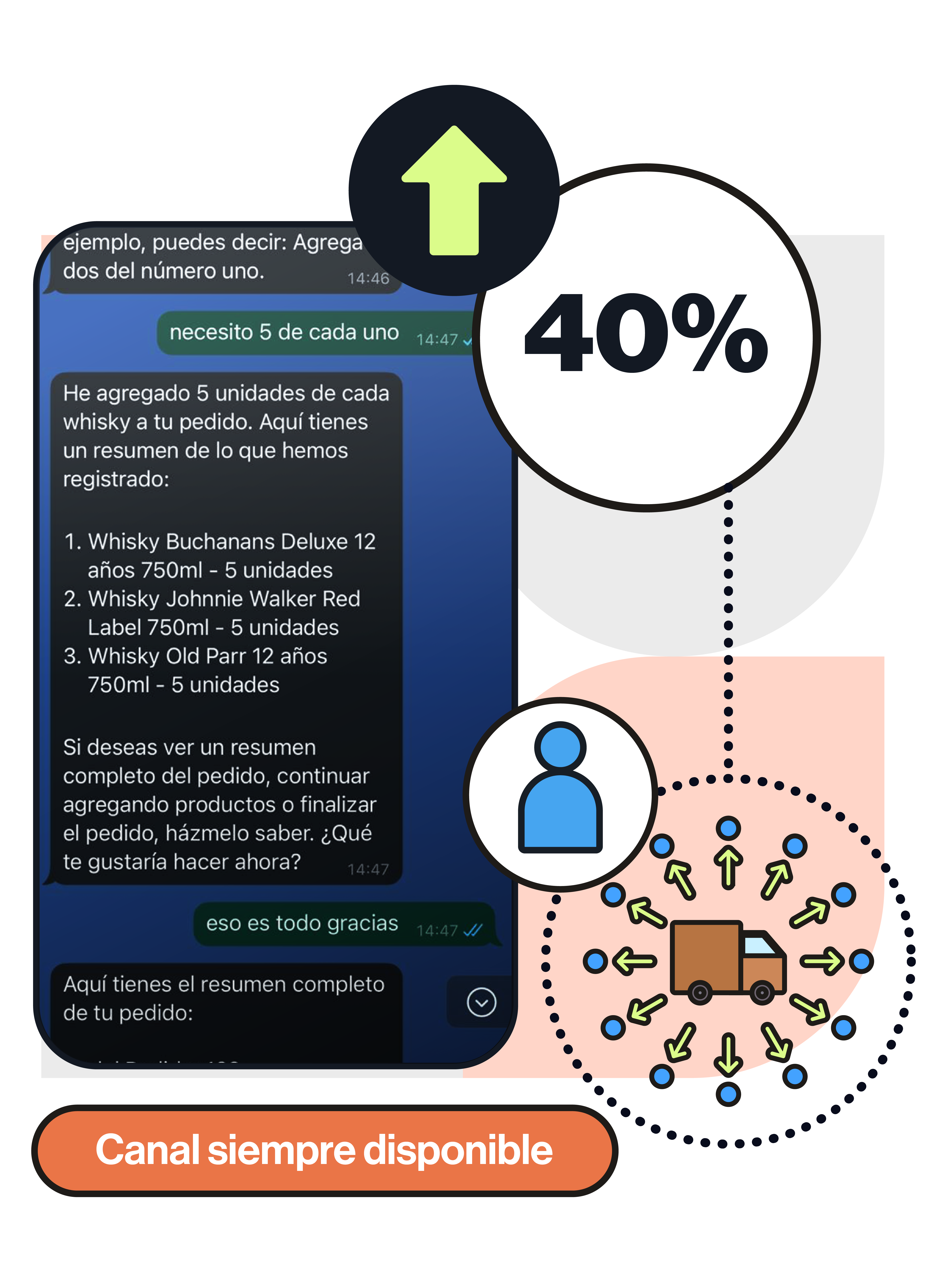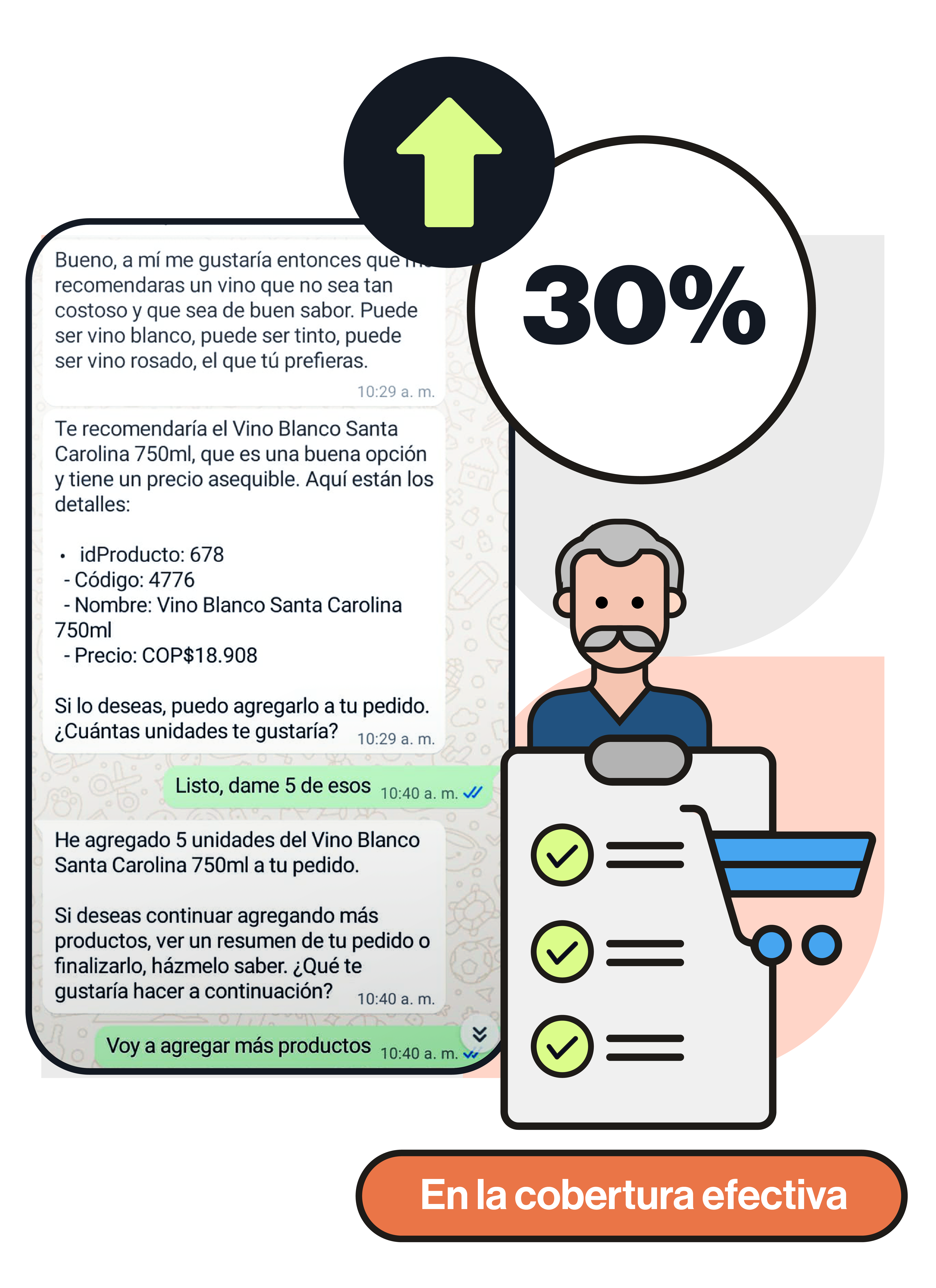 El asistente garantiza que todos los tenderos puedan realizar pedidos en cualquier momento, incluso si no se logra realizar la visita física. Esto asegura que nunca se queden sin productos y evita que busquen alternativas con la competencia.