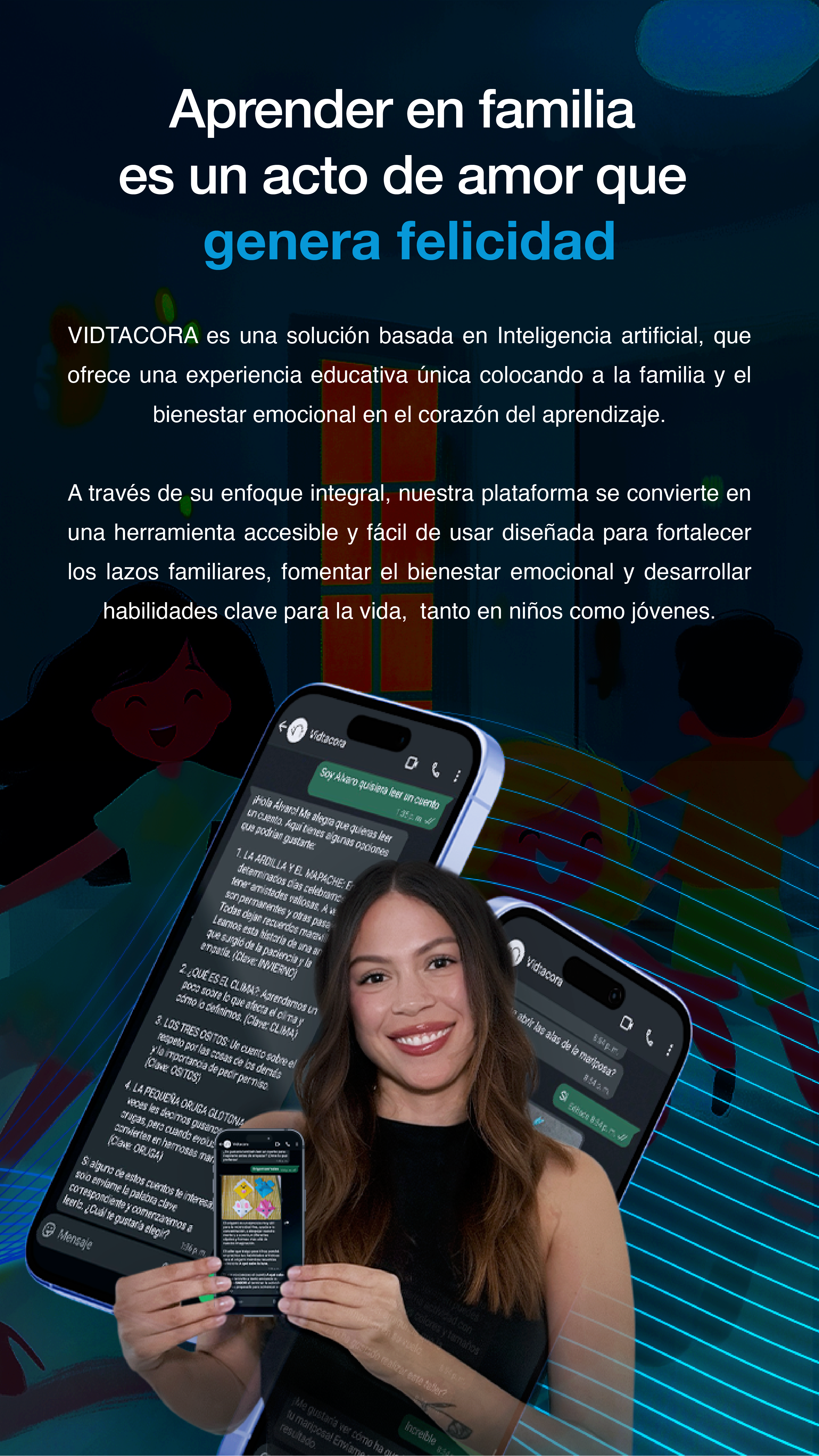 En VIDTACORA creemos que la educación debe ser una experiencia compartida que involucre a todos los miembros de la familia, donde apoyamos a padres e hijos en el desarrollo de habilidades clave para la vida, mientras promovemos el bienestar emocional y la felicidad en el hogar. Nuestra plataforma  apoya a las instituciones académicas, brindando una herramienta flexible que mejora el aprendizaje y facilita el seguimiento del progreso de cada estudiante.